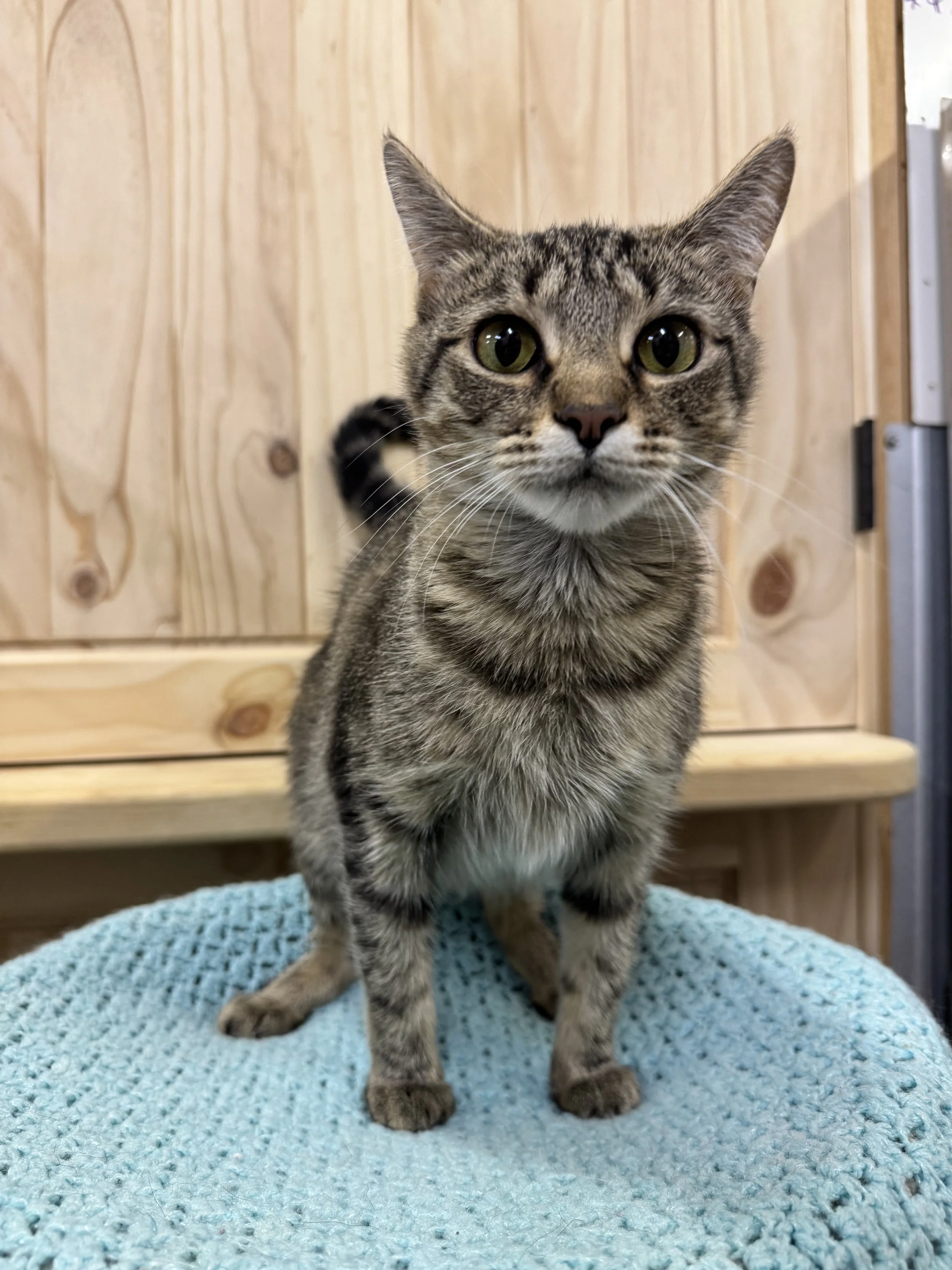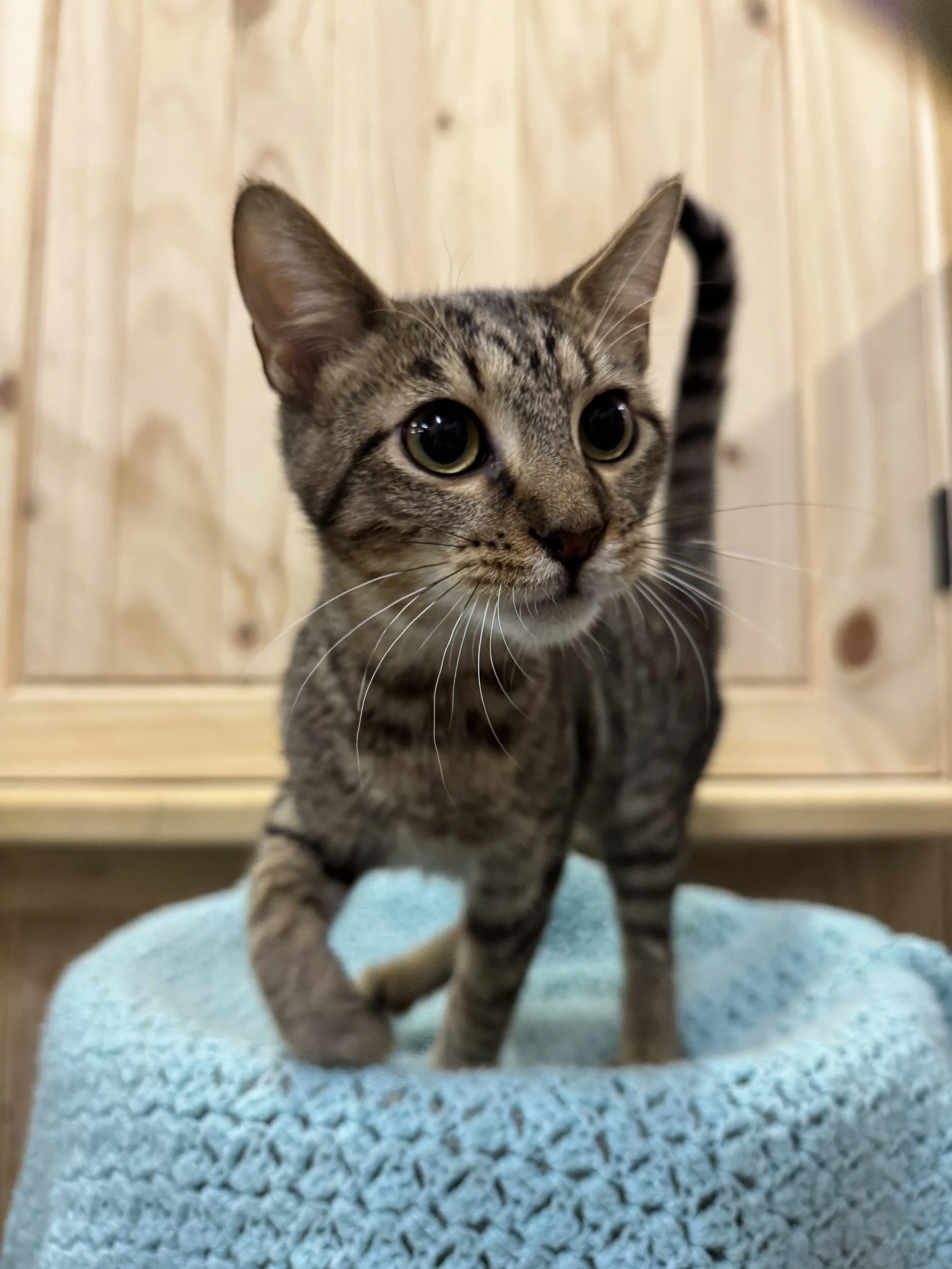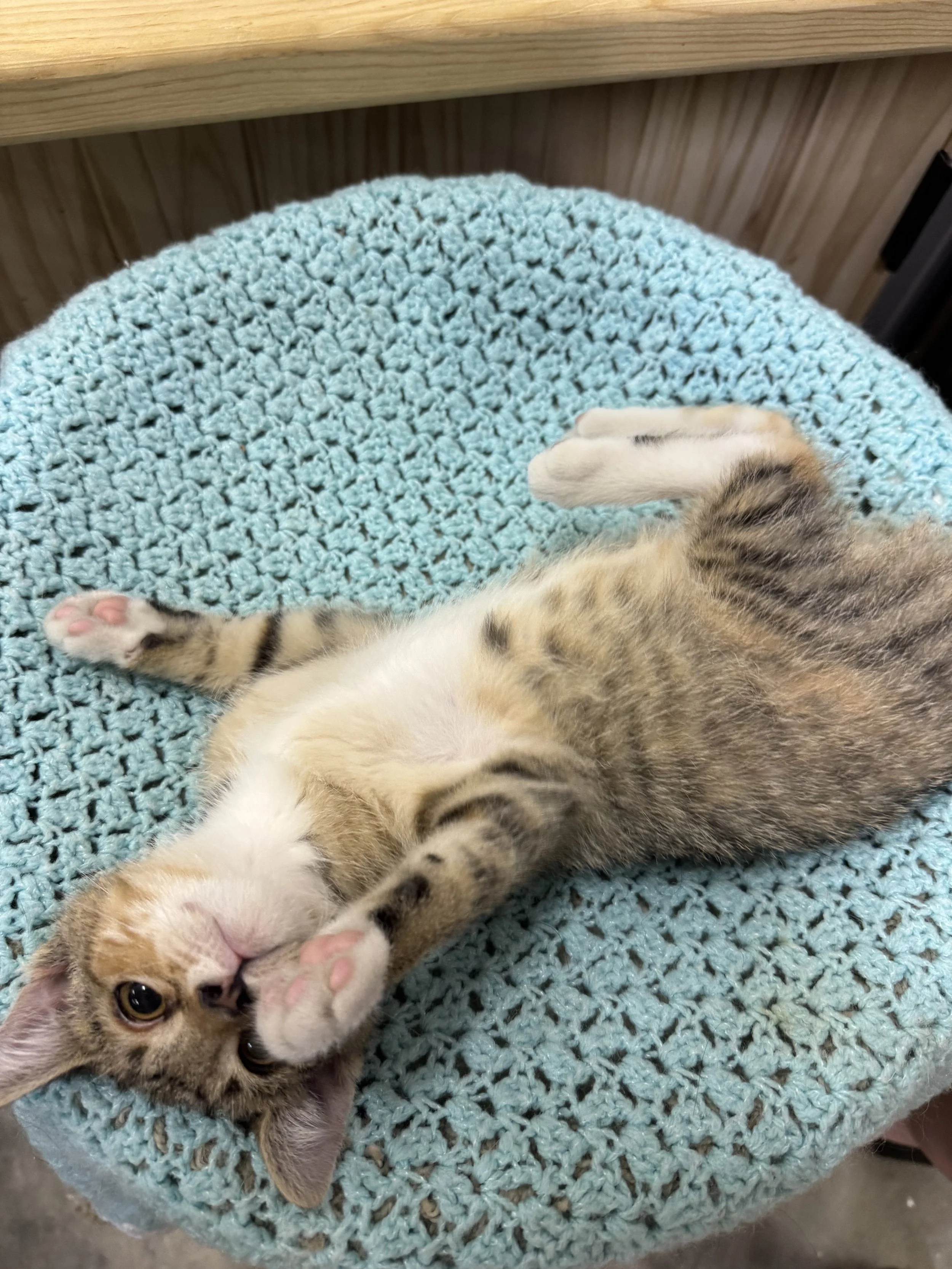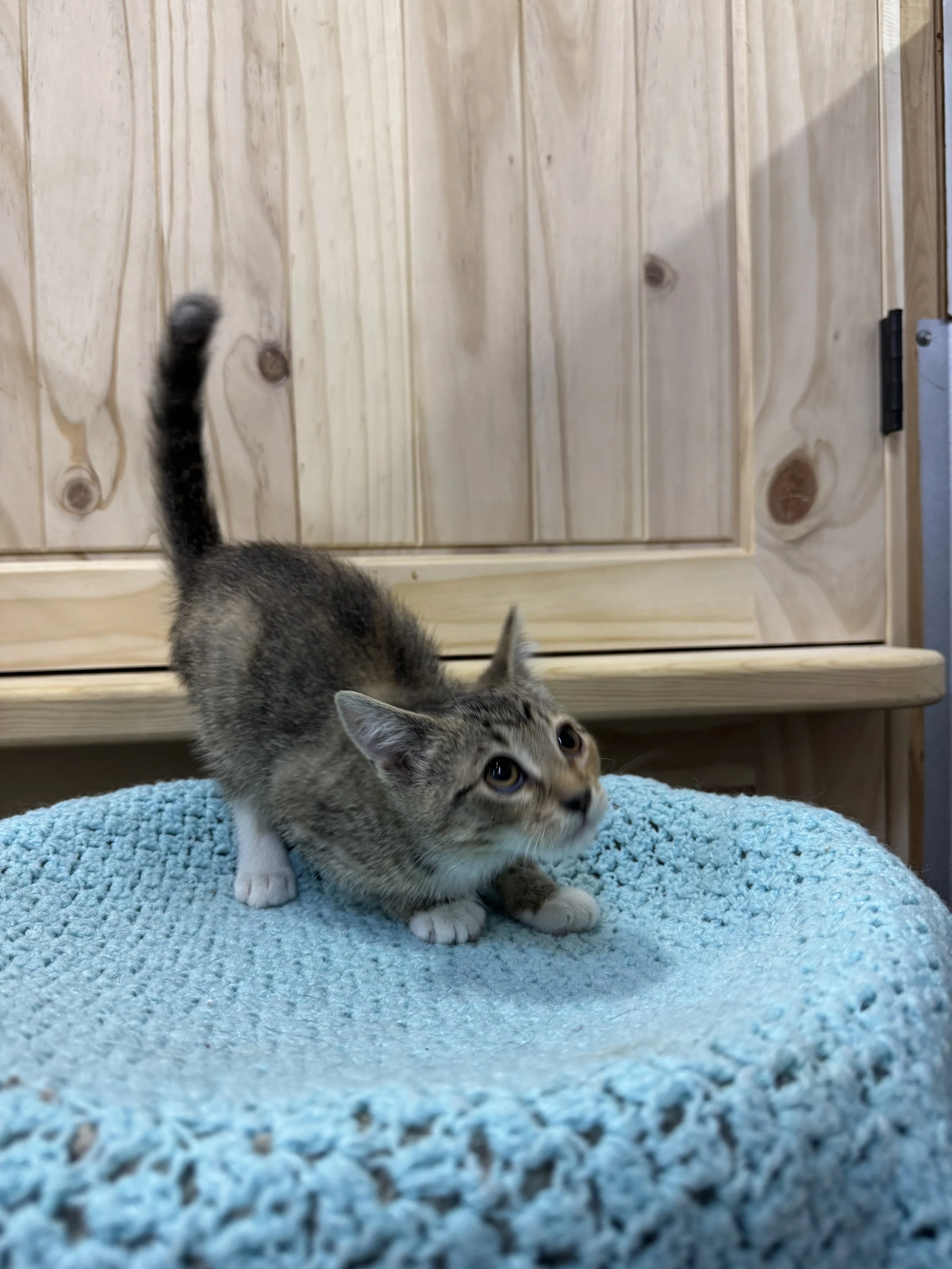 Meet this sweet and spunky little lady who’s almost ready to find her furever home! She and her sister, Dots, were born on June 8th and have been thriving in our care ever since. From the very start, this little one has stood out with her playful nature, adventurous spirit, and curiosity about the world around her. She’s always the first to explore new toys, climb new heights, and greet her caretakers with happy purrs.