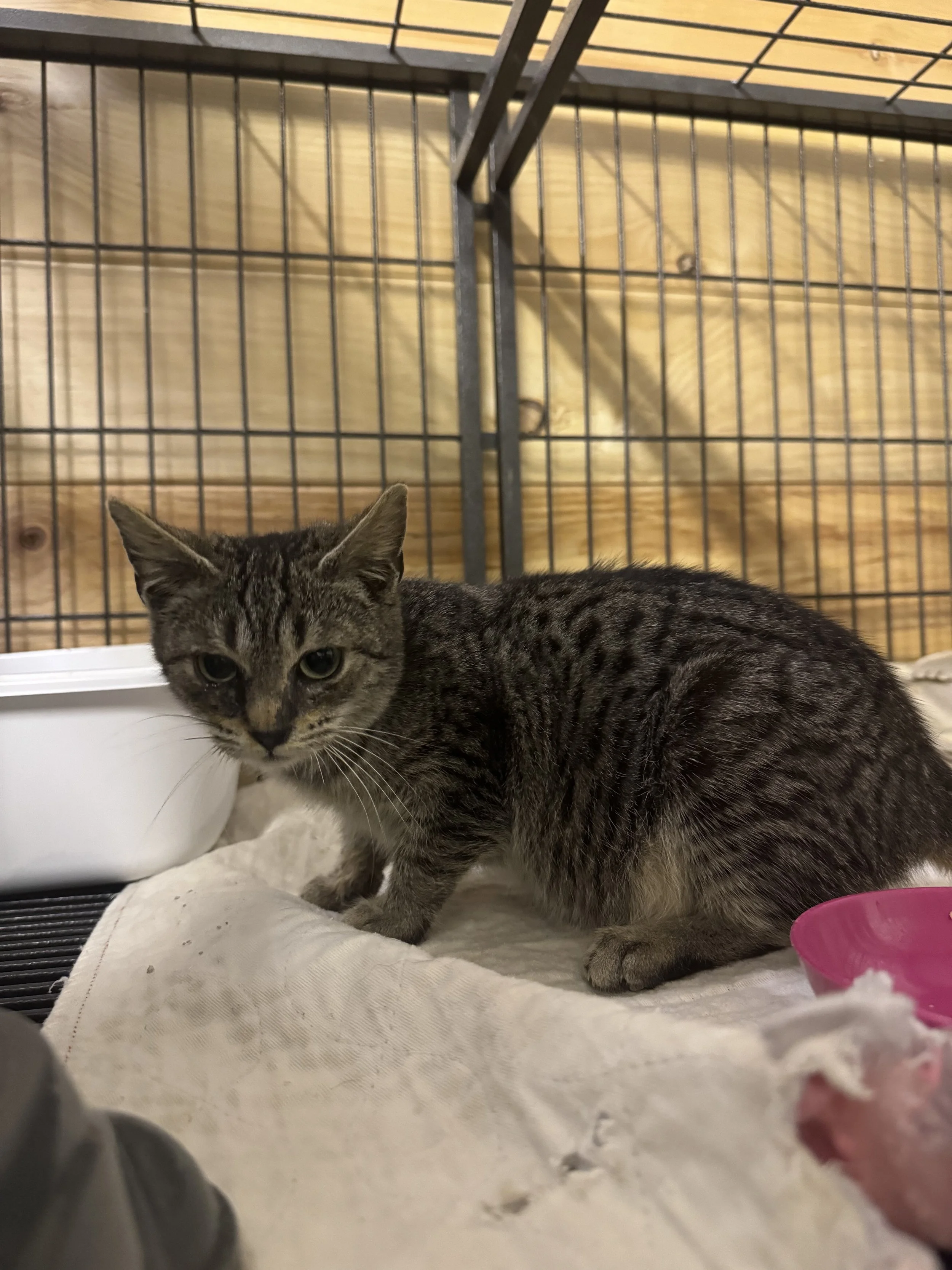 While searching for a pregnant female dog, we set a humane trap with the intention of bringing her into our care. Although she was later found and is now safe and available, the trap initially caught a grey male cat instead. He was clearly feral at the time of capture.